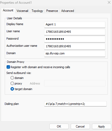Log in to your IllyVoIP account and navigate to the SIP Accounts section. Copy your SIP Username, SIP Password, and Domain/Server from this section.