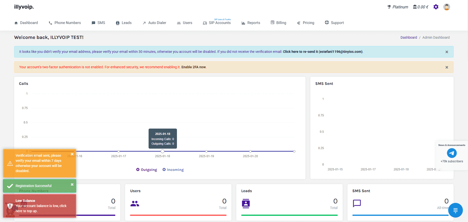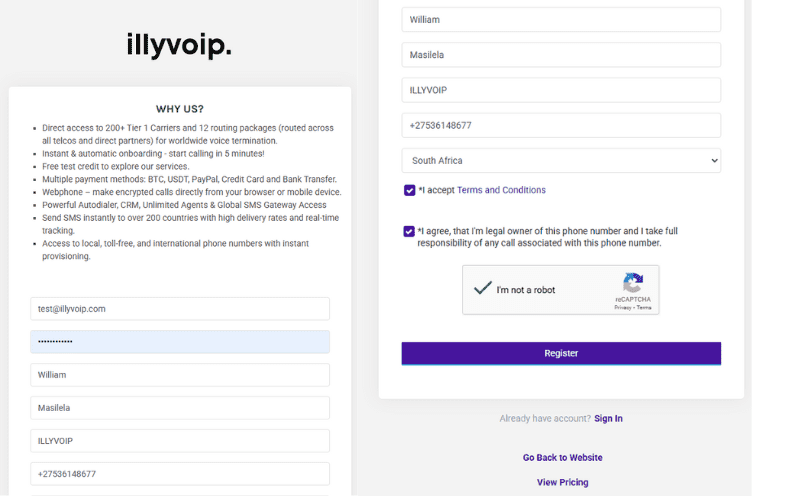 Enter your full name, email address, and password into the provided text boxes. From time to time, IllyVOIP may offer promotional credits. Once you’ve completed registration, you’ll receive a confirmation email to verify your account.