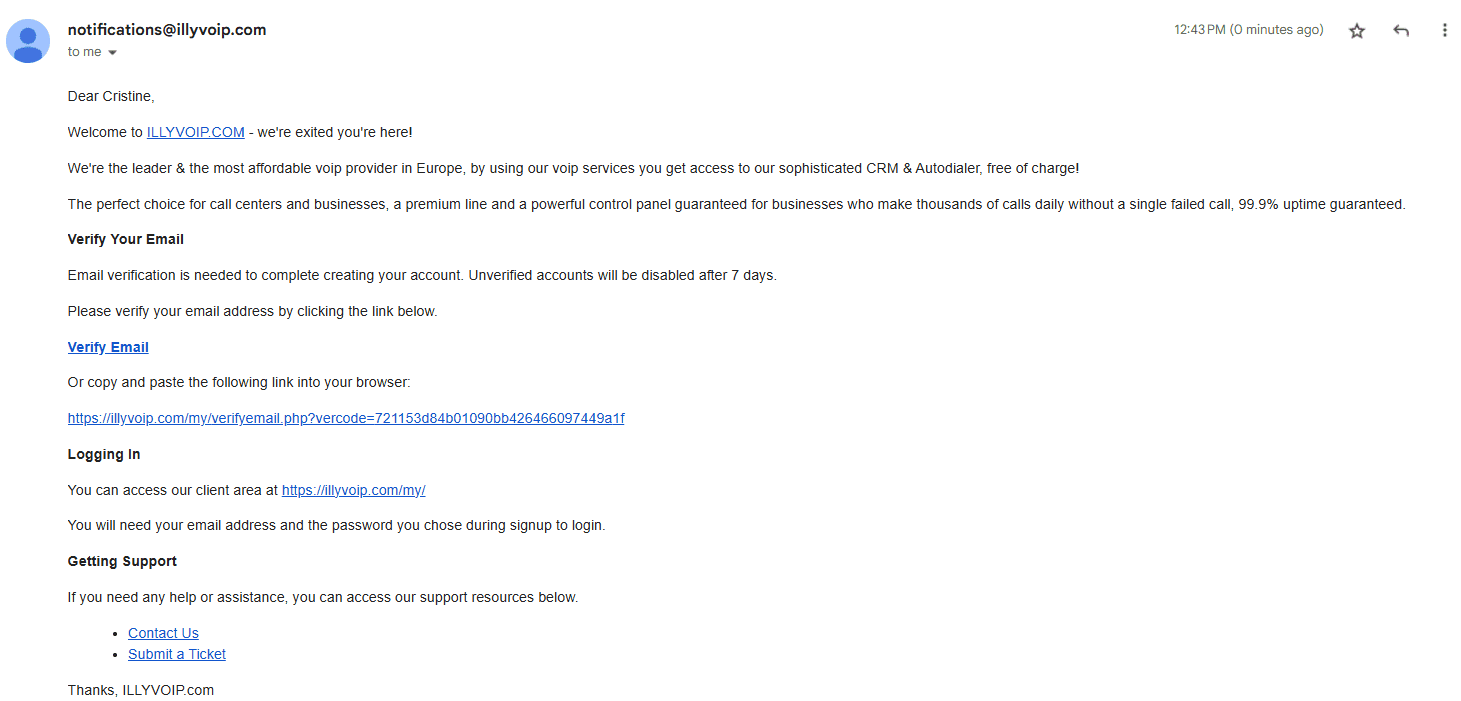After signing up, check your email inbox for a message from IllyVOIP. Inside, you’ll find a confirmation email with a link to activate your account.