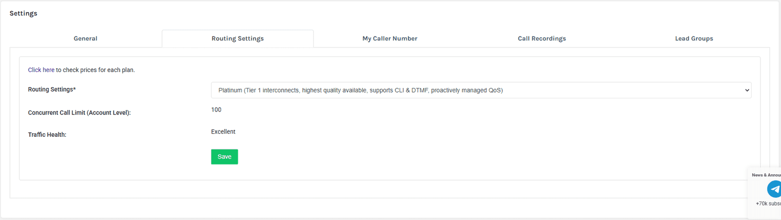 Routing Settings: Choose the routing plan you want to use for your calls.